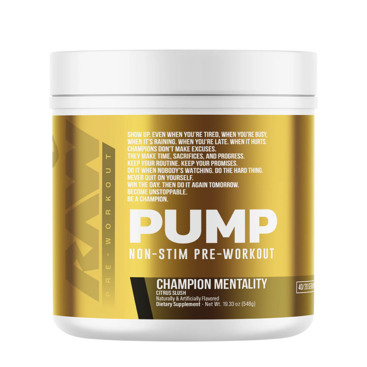 This bring you our non-stimulant, performance supporting formula: RAW Pump. This non-stimulant pump formulation not only provides powerful pumps, but also assists with nutrient uptake, improves cellular hydration, and delivers delicious taste with our pineapple and watermelon flavor options.