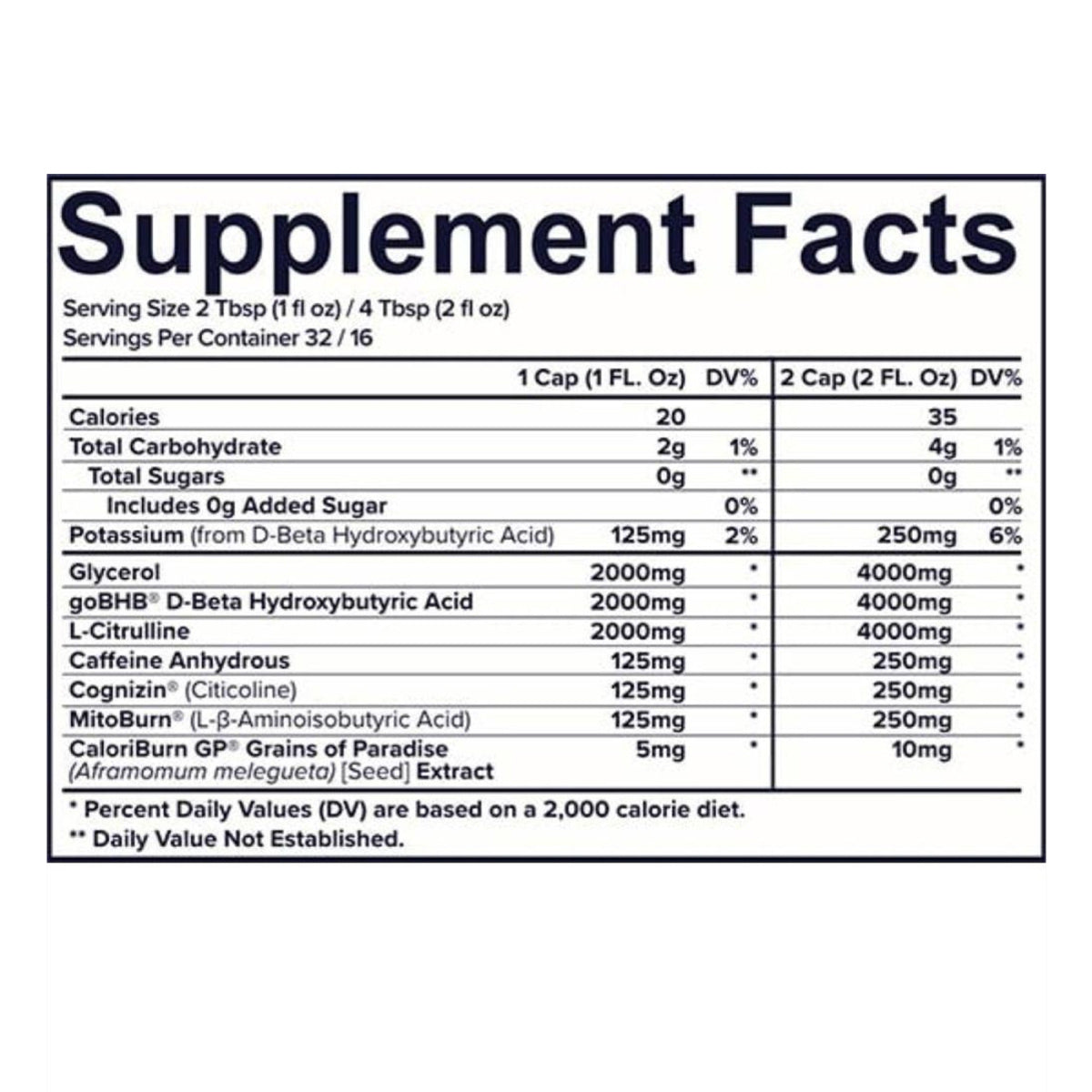 Potassium (from D-Beta Hydroxybutyric Acid): 125mg (2% DV) / 250mg (6% DV)